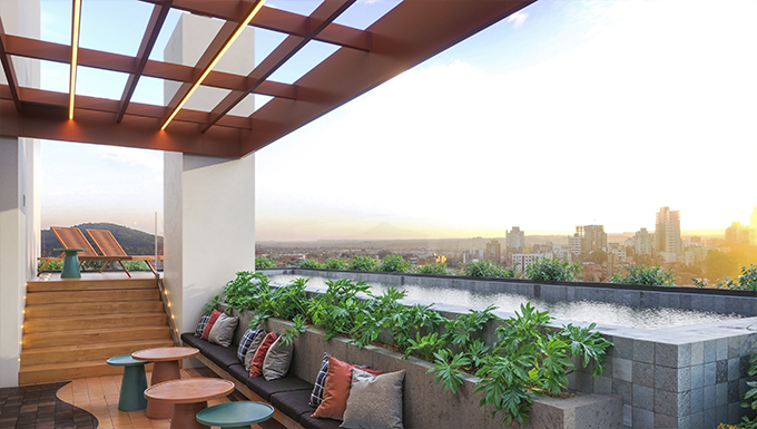 A organização programática segue um gradiente que transita do urbano ao contemplativo. No embasamento, em maior proximidade com a rua, concentram-se unidades compactas e stúdios. No volume superior, posicionam-se unidades de maior metragem, entre 1 e 2 dormitórios, com caráter mais permanente. O percurso culmina no rooftop condominial, onde as áreas comuns assumem um caráter social e contemplativo.