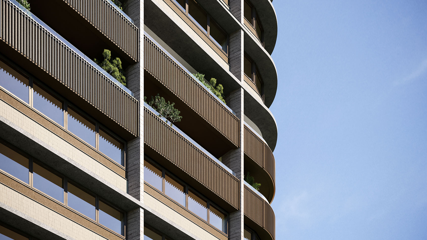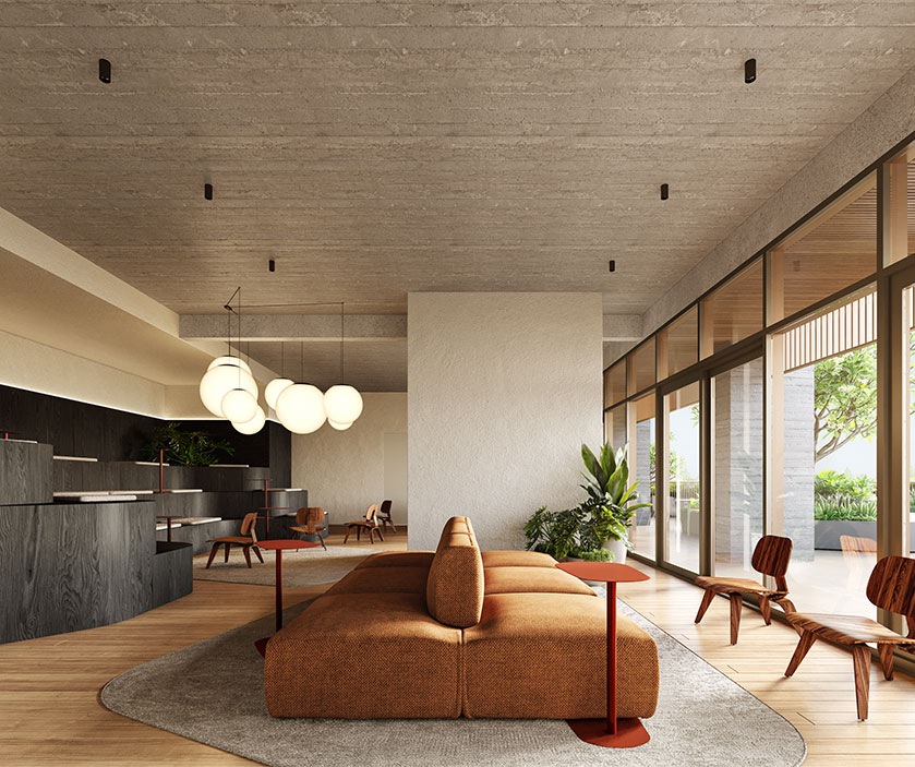 O mesmo rigor se aplica à composição da fachada. O concreto aparente serve como estrutura, contribuindo para a estética do edifício. A metalurgia em tons mais quentes contrasta com o concreto, remetendo às cores do Cerrado, região onde o projeto está localizado, destacando pontos-chave do edifício. O Tempo equilibra efetivamente os aspectos orgânicos das interações urbanas e das conexões humanas com a racionalidade de um design eficiente e inteligente, concebido para as pessoas.