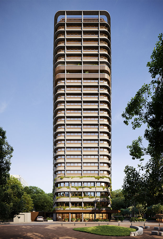 Os volumes do projeto propõem uma transição de escalas. Por ser um edifício alto, é crucial considerar cuidadosamente seu impacto no entorno e nos pedestres. Portanto, como estratégia, dividimos o volume em três partes: Um embasamento inferior de 4 pavimentos, que realiza o que é chamado de "Olhos na Rua", conceito amplamente conhecido por Jane Jacobs em seu livro "A Morte e a Vida das Grandes Cidades Americanas". Esse conceito propõe uma relação próxima entre quem está dentro do edifício e quem passa pela rua, proporcionando conexão visual direta e maior segurança para os pedestres no bairro.