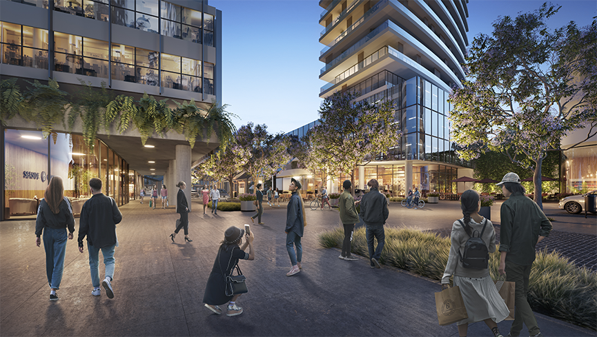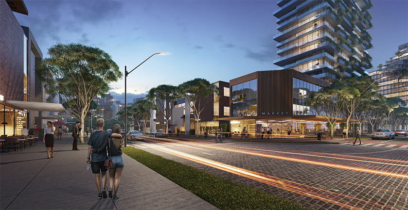 A rua acalmada se expande para os miolos de quadra: uma estratégia de conforto térmico através do sombreamento. Esses miolos são espaços de fruição pública dentro dos espaços privados dos lotes, gerando caminhos peatonais que revelam lojas e áreas comerciais protegidas do calor e intempéries. O microclima criado auxilia na criação de térreos ativos que dão vida para o bairro.