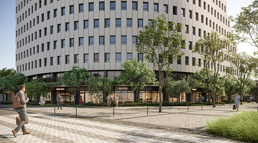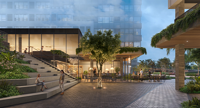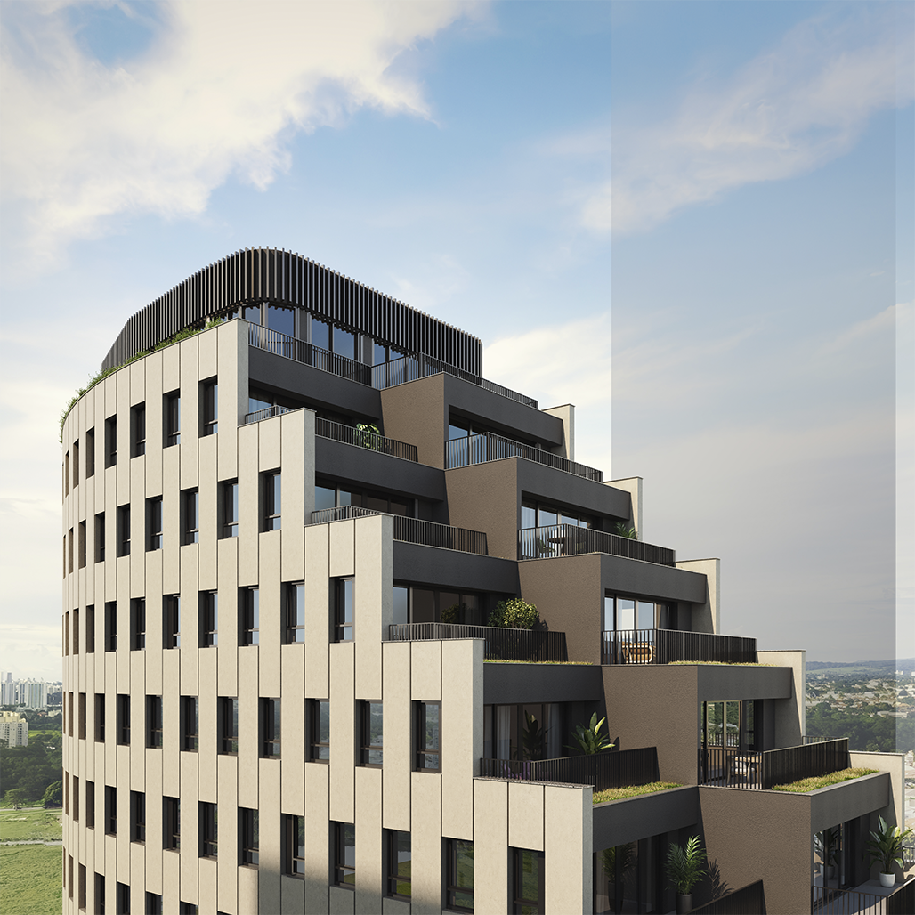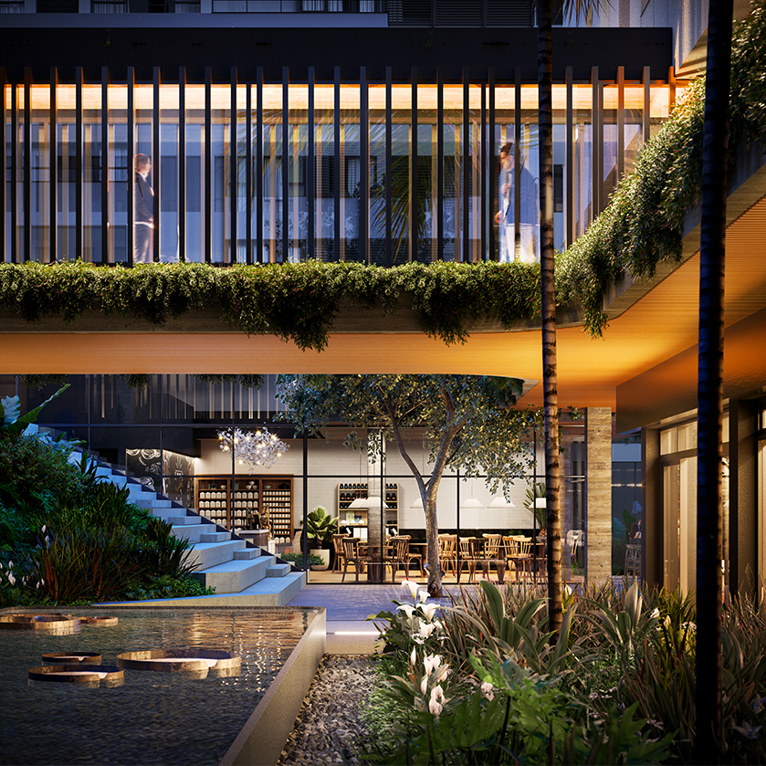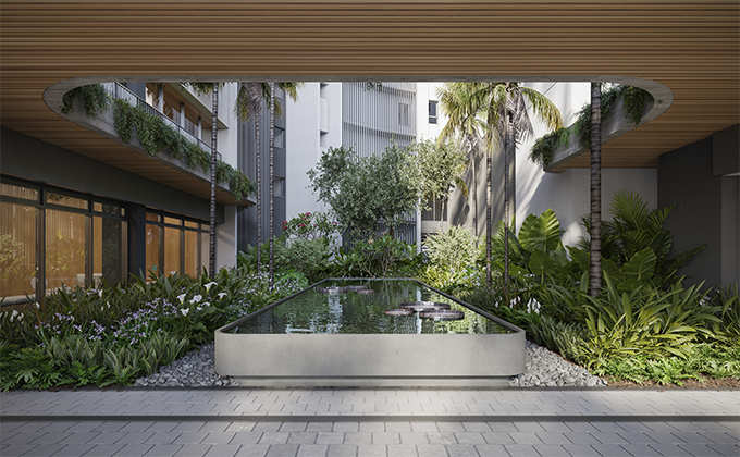 A partir do entendimento de que as áreas comuns e o átrio vegetado estão no centro do complexo, foi lançado o caráter do projeto, que propõe espaços de respiro e descompressão junto ao paisagismo abundante, consistindo em um edifício comercial amplamente conectado - à urbanidade e ao verde - potencializando, ao mesmo tempo, o bem-estar, as trocas e as conexões.
