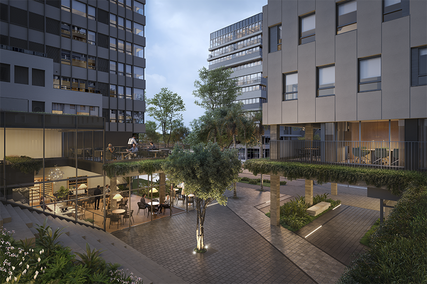 Um ponto central na implantação do Edro e do Masterplan da Quadra F é o entendimento de que a ativação urbana está no perímetro do conjunto, e não no miolo de quadra - para preservar a hierarquia de atividade de gastronomia e comércio da Rua Coberta (na quadra vizinha). A Rua Coberta, por sua vez, onde atinge a testada do terreno do Edro, cria um pocket park que culmina no átrio vegetado para o qual se voltam as torres e as áreas comuns.