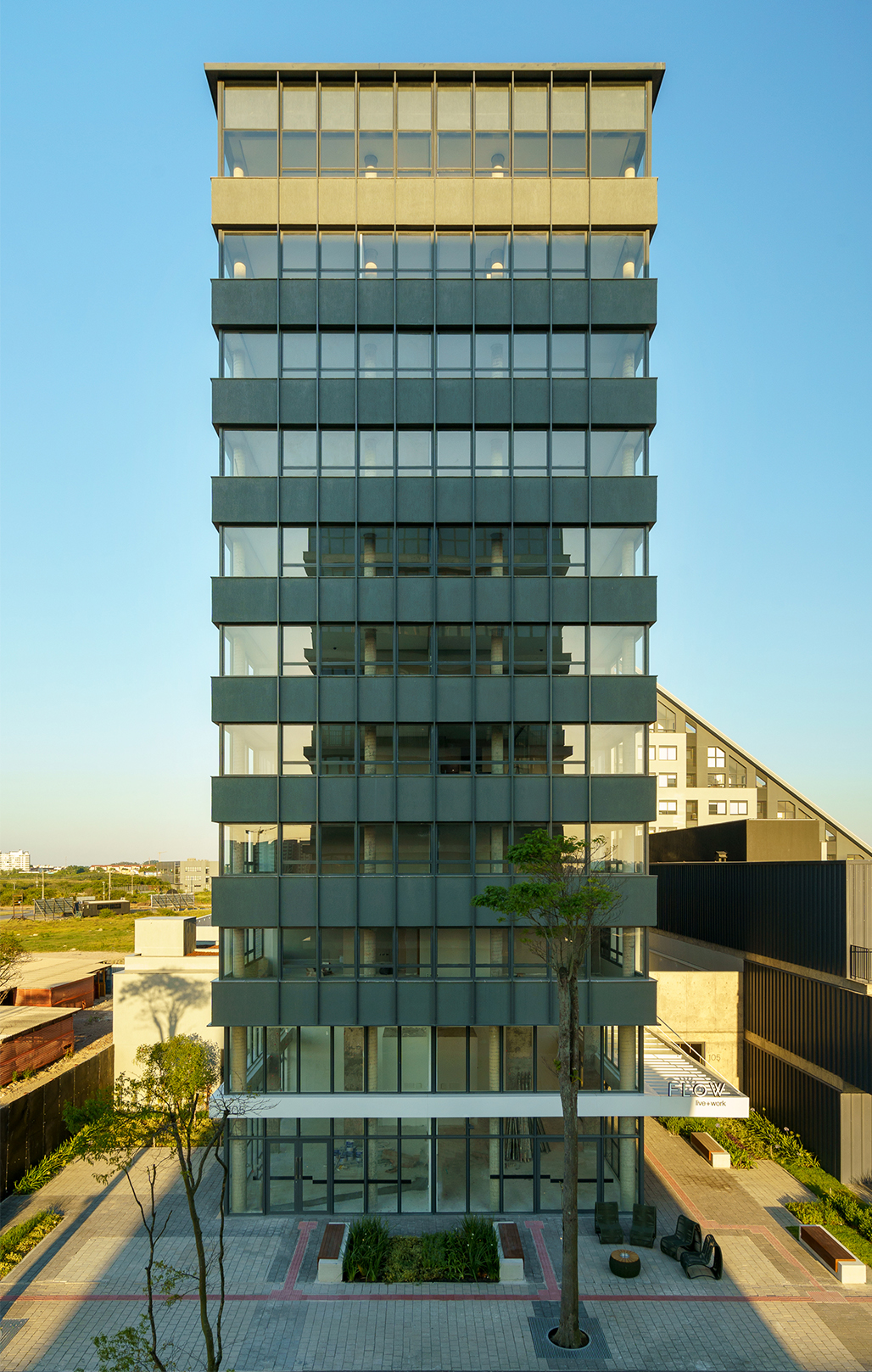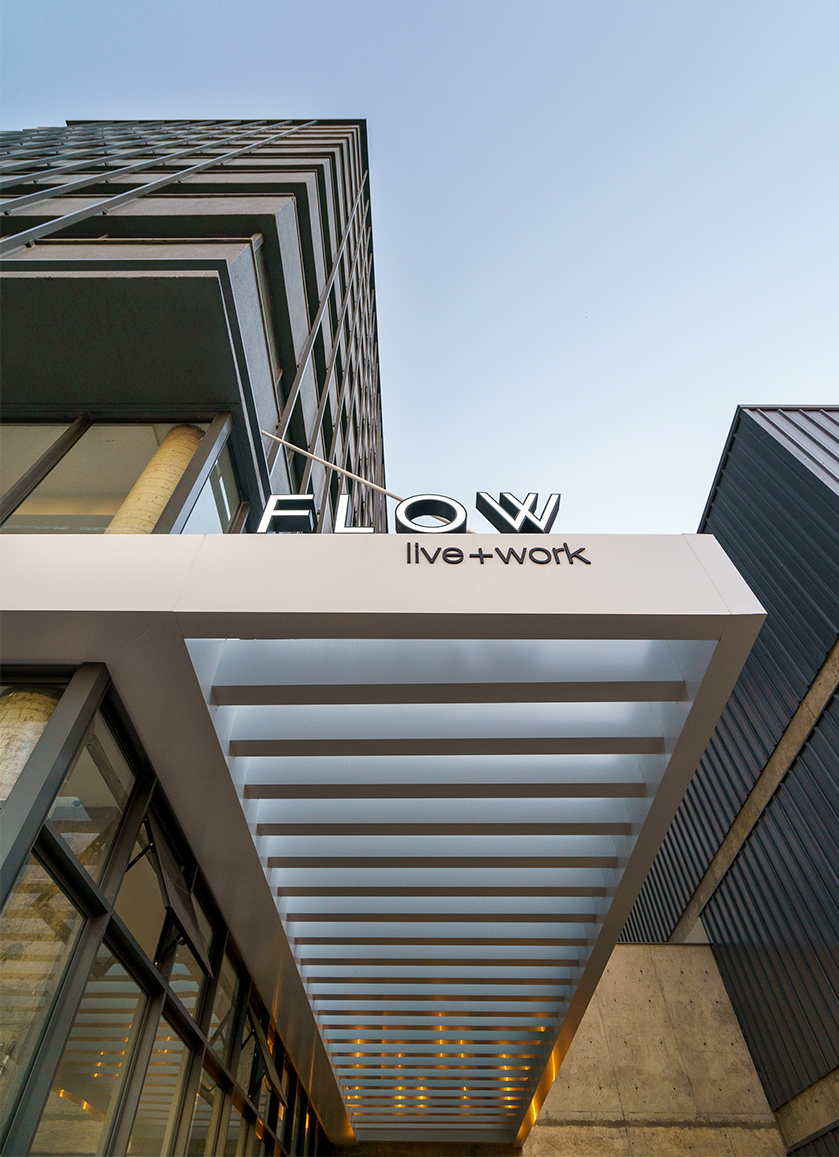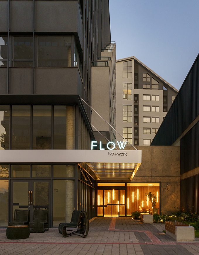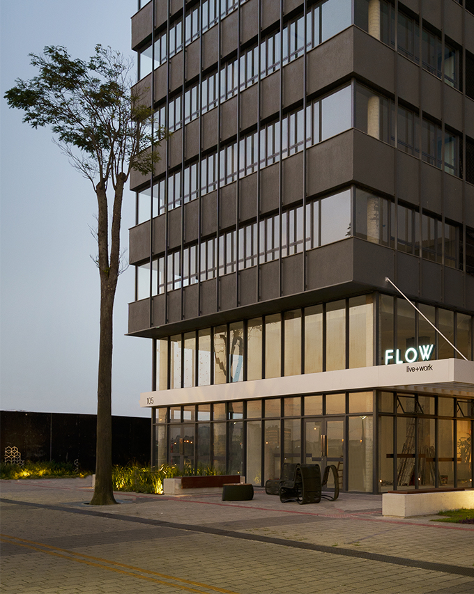 A torre comercial cria a conexão entre as tipologias dos blocos ortogonais do setor comercial do bairro e a forma única do edifício do Flow Liv com seu grande telhado inclinado. Desta forma o corpo da edificação é dividido em dois: um bloco branco, escalonado e com terraços, recriando a inclinação da edificação residencial; e um bloco cinza, ortogonal e envidraçado, criando uma conexão morfológico com as edificações vizinhas. A edificação possui salas comerciais variando entre 28m² e 40m² com a opção de ter um pequeno terraço. Todas as unidades da fachada sul possuem vistas desobstruídas para o parque. O hall dos elevadores em cada pavimento possui iluminação natural, ajudando a minimizar custos de manutenção. No pavimento térreo, duas lojas irão ativar a fachada urbana no edifício junto à rua principal do bairro.