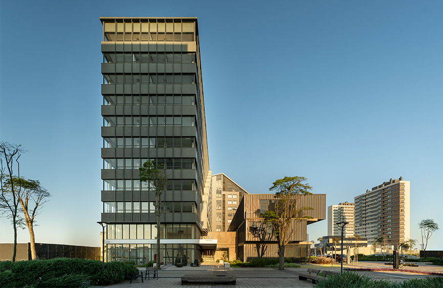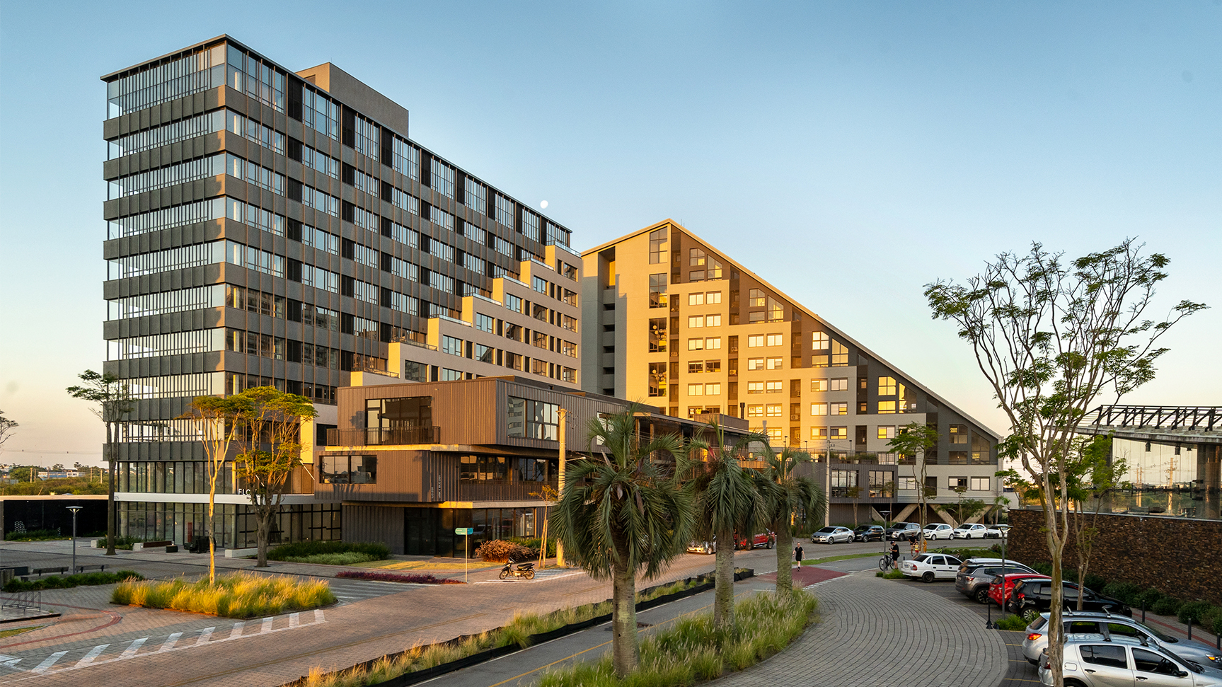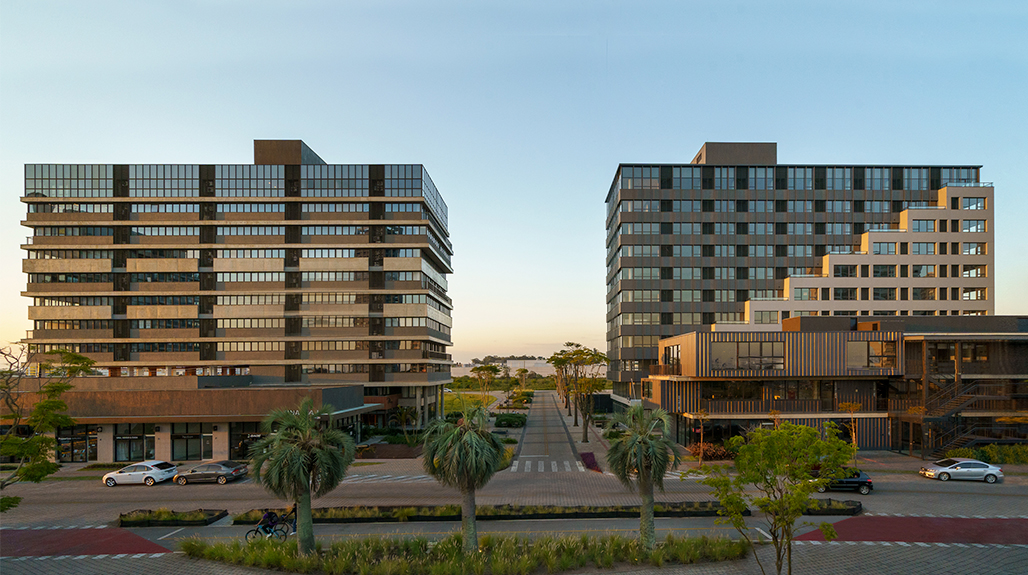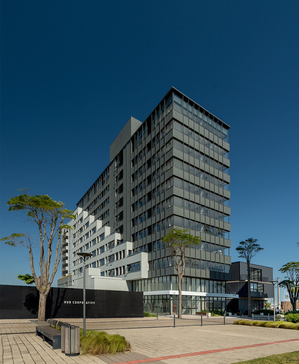 A torre comercial cria a conexão entre as tipologias dos blocos ortogonais do setor comercial do bairro e a forma única do edifício do Flow Liv com seu grande telhado inclinado. Desta forma o corpo da edificação é dividido em dois: um bloco branco, escalonado e com terraços, recriando a inclinação da edificação residencial; e um bloco cinza, ortogonal e envidraçado, criando uma conexão morfológico com as edificações vizinhas. A edificação possui salas comerciais variando entre 28m² e 40m² com a opção de ter um pequeno terraço. Todas as unidades da fachada sul possuem vistas desobstruídas para o parque. O hall dos elevadores em cada pavimento possui iluminação natural, ajudando a minimizar custos de manutenção. No pavimento térreo, duas lojas irão ativar a fachada urbana no edifício junto à rua principal do bairro.