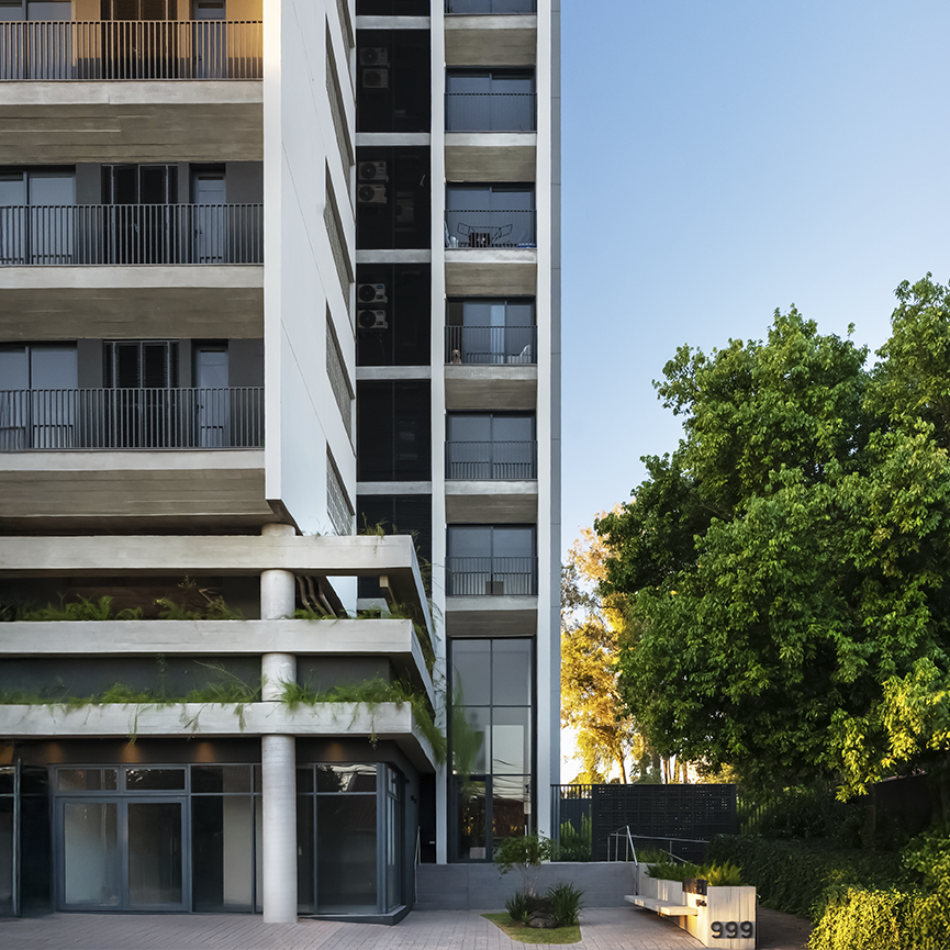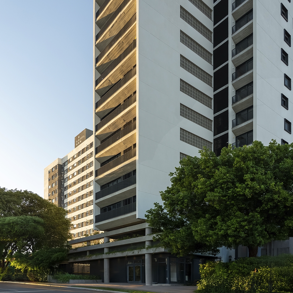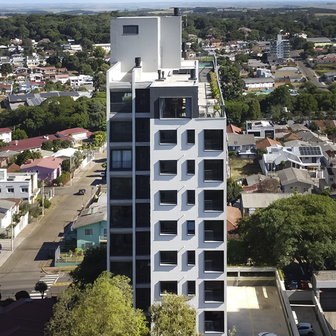 O edifício Hausen, localizado em Passo Fundo, explora o conceito de arquitetura sensorial, com Branding desenvolvido pelo Núcleo NAV. Através dos cinco sentidos e da intuição, propõe a conexão com o usuário e, consequentemente, a composição do lar a partir das experiências. Dessa forma, o processo de desenvolvimento do projeto teve como diretriz o ressalto dos sentidos. No térreo, o espaço comercial gera a integração do exterior com interior, proporcionando uma área convidativa tanto para os usuários quanto para os pedestres. A conexão da edificação com o exterior também pode ser observada na aplicação de materiais naturais e vegetações na fachada, nas sacadas abertas presentes nos apartamentos, e na cobertura, onde os sentidos são ainda mais aguçados. O rooftop dispõe de áreas condominiais com um lounge que se torna um mirante com vista para a cidade. Nas fachadas, o jogo de esquadrias gerado a partir da distinção entre pavimentos tipo ímpar e par, gera dinamicidade. Além disso, a diferenciação dos volumes da torre destaca as diferentes tipologias de apartamentos presentes no projeto. Para reforçar a atenção aos sentidos e proporcionar maios conforto ao usuário, soluções de isolamento acústico também são aplicadas em projeto.
