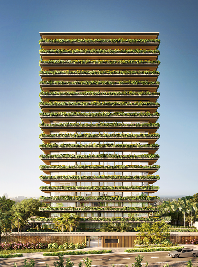 O Tomaz inspira delicadeza e imponência ao mesmo tempo. É generoso no que tange às sensações: ambientes amplos, muita integração interior-exterior, paisagismo tropical como protagonista e todas as áreas condominiais com o nível de conforto de uma casa. Projetamos uma arquitetura feita de detalhes e sutilezas para que a natureza e a vida possam ser exuberantes.A escolha de materialidade busca a fusão harmônica entre arquitetura e natureza, de maneira a se unirem em um só elemento. O brise de madeira envolve a fachada posterior da torre, promovendo privacidade aos apartamentos ao mesmo tempo que viabiliza as visuais privilegiadas ao verde da área externa.A base da edificação recebe todos os seus acessos. O hall de entrada e o living, posicionados ao lado do jardim, se beneficiam da conexão com o verde e da luz que entra através dos planos envidraçados. O segundo pavimento abriga espaços de convívio e lazer, que priorizam a sensação de bem-estar e aconchego através da fluidez dos espaços e da dissolvência das fronteiras visuais com o exterior. Cercado por floreiras, recebe o verde em seu interior e reforça o conforto dos ambientes.As áreas externas abraçam a natureza e comportam espaços voltados ao bem-estar, a fim de levar maior qualidade de vida aos moradores. A torre acontece a partir do terceiro pavimento, apresentando duas tipologias de apartamentos, de 230m² e 460m². Como característica comum, recebem floreiras em seu perímetro, que se tornam protagonistas da fachada. No topo, apartamentos duplex dispõem de terraços privativos com visuais agradáveis para a cidade.